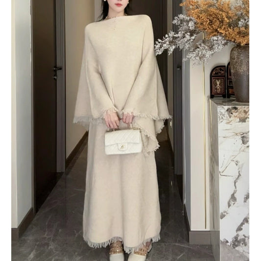 Women's Knitted Cape Suit Set - Tassel Two Piece Outfit